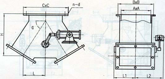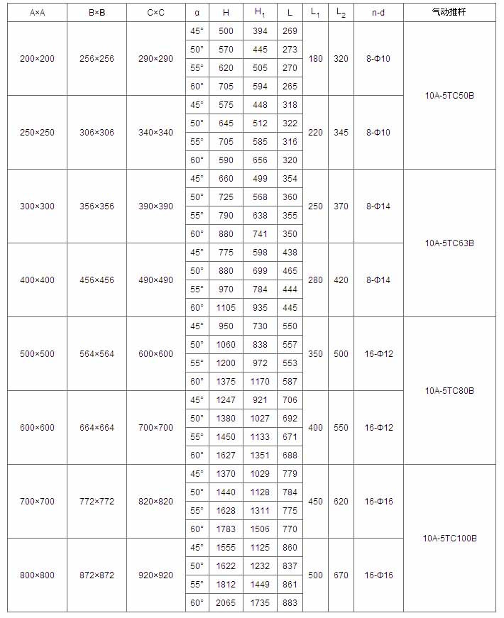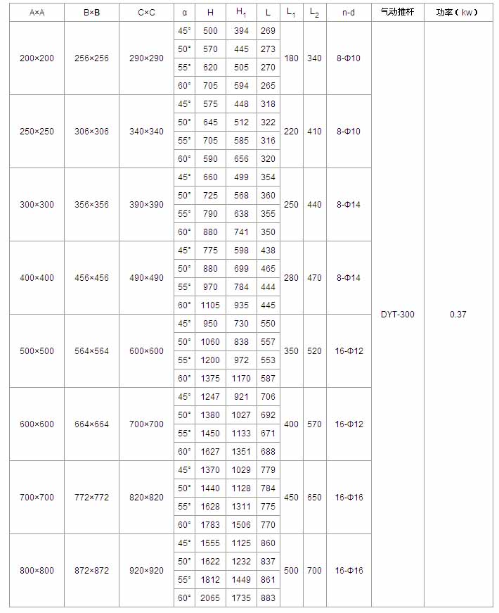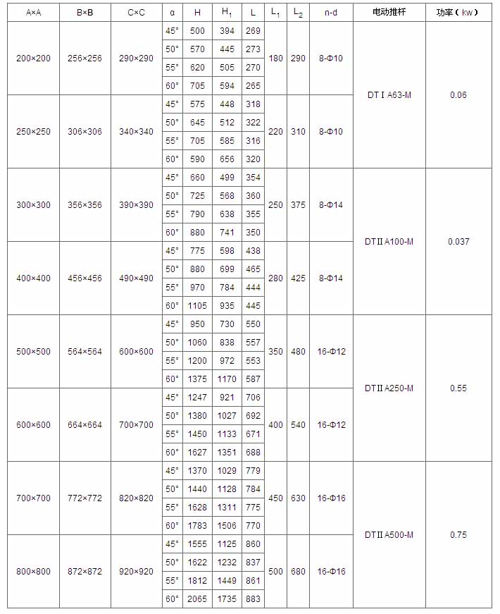 | A×A | B×B | C×C | α | H | L | L1 | L2 | n-d | 電動(dòng)裝置 | 功率(kw) |