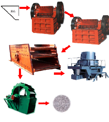 沙石生產線,砂石生產線,砂石生產線設備,砂石線,砂石生產設備基本流程:大塊石料經料倉由振動給料機均勻地送進鄂式破碎機進行粗碎,粗碎后的石料由皮帶輸送機送到反擊式破碎機進行進一步破碎;不滿足粒度要求的石子由皮帶輸送機返料送到反擊式破碎機進行再次破碎,形成閉路多次循環(huán)。細碎后的石料由皮帶輸送機送進振動篩進行篩分,篩分出幾種不同規(guī)格的石子,滿足粒度要求的石子由成品皮帶輸送機送往成品料堆;成品粒度可按照用戶的需求進行組合和分級,為保護環(huán)境,可配備輔助的除塵設備。