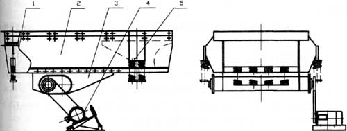 ZSW系列振動喂料機是利用兩個呈特定位置的偏心軸以齒輪相嚙合而組成激振器,裝配時必須使兩齒輪按標(biāo)記相嚙合,然后通過電機驅(qū)動,使兩偏心軸旋轉(zhuǎn),從而產(chǎn)生巨大合成的直線激振力,使機體在支承彈簧上作強制振動,物料則以此振動為動力,在料槽上作滑動及拋擲運動,從而使物料前移而達到給料目的。當(dāng)物料通過槽體上的篩條時,較小的料可通過篩條間隙而落下,可不經(jīng)過下道的破碎工序,起了篩分的效果。產(chǎn)品結(jié)構(gòu)及技術(shù)參數(shù)