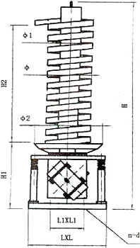 ZC系列垂直振動(dòng)輸送機(jī)的驅(qū)動(dòng)裝置振動(dòng)電機(jī)安裝在輸送塔下部,兩臺(tái)振動(dòng)電機(jī)對(duì)稱交叉安裝,輸送塔由管體和焊接在管體周圍的螺旋輸送槽組成,輸送塔座于減振裝置上,減振裝置由底座和隔振彈簧組成。(見(jiàn)圖一)當(dāng)垂直輸送機(jī)工作時(shí),根據(jù)雙振動(dòng)電機(jī)自同步原理,由振動(dòng)電機(jī)產(chǎn)生激振力,強(qiáng)迫整個(gè)輸送塔體作水平圓運(yùn)動(dòng)和向上垂直運(yùn)動(dòng)的空間復(fù)合振動(dòng),螺旋槽內(nèi)的物料則受輸送槽的作用,作勻速拋擲圓運(yùn)動(dòng),沿輸送槽體向上運(yùn)動(dòng),從而完成物料的向上(或向下)輸送作業(yè)。